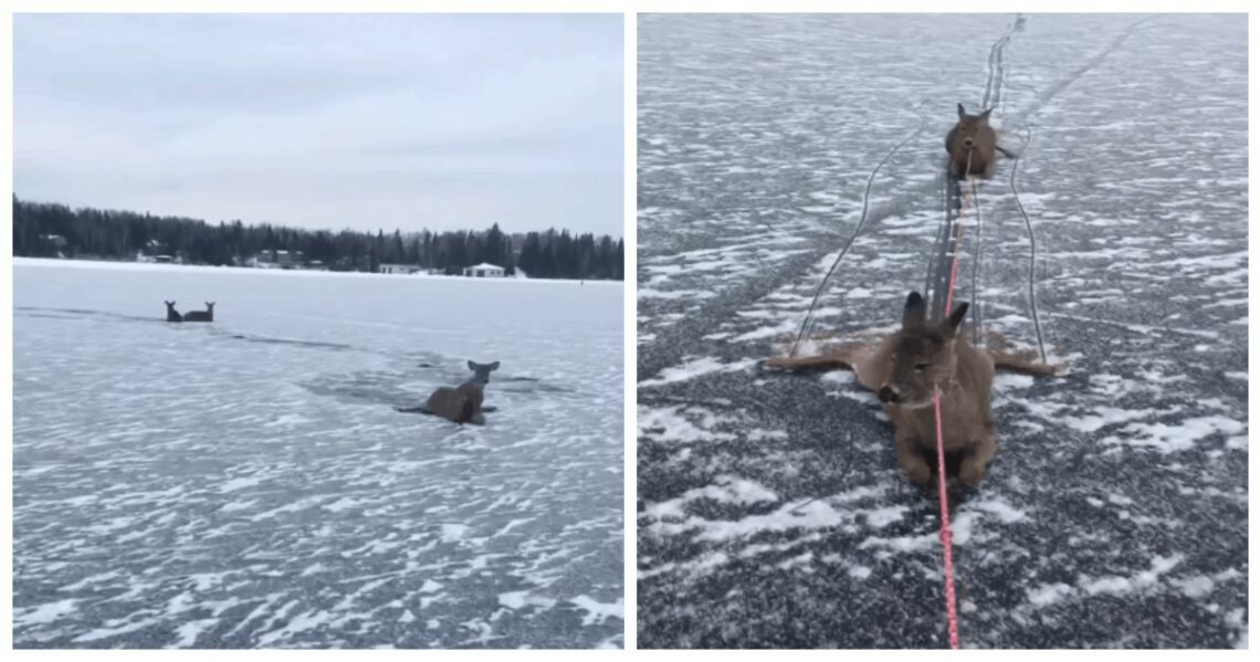 Конькобежец не оставил оленей в беде. С помощью веревки мужчина взял на буксир парнокопытных и доставил их до ближайшего берега. Несчастных пришлось буквально выталкивать на берег, иначе измученные олени не могли выбраться со льда.