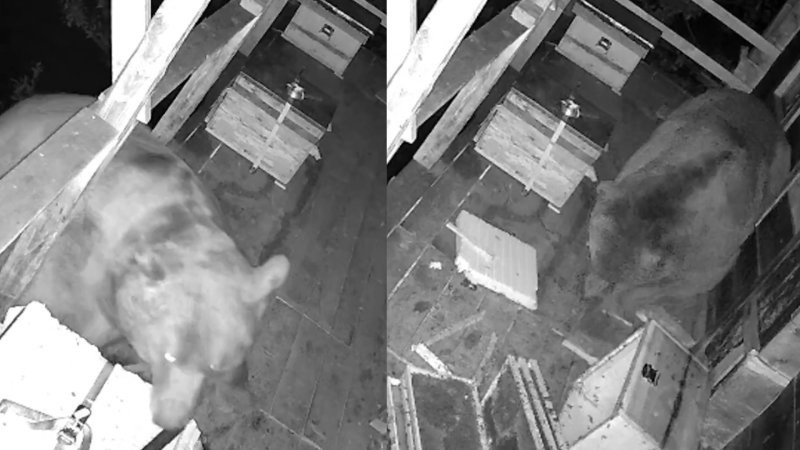 На кадрах с камеры наблюдения видно, как крупный медведь с легкостью взбирается на балкон, оторвав деревянные перила. После чего косолапый разломал деревянный улей и насладился медом.