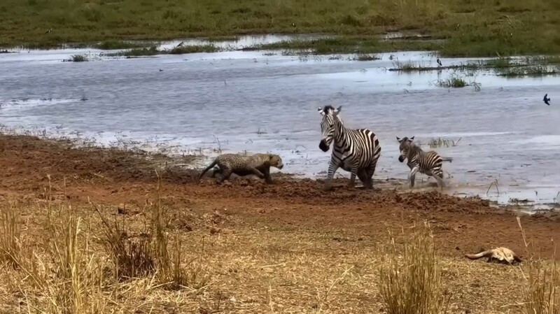 Зебра с детенышем отбились от леопарда