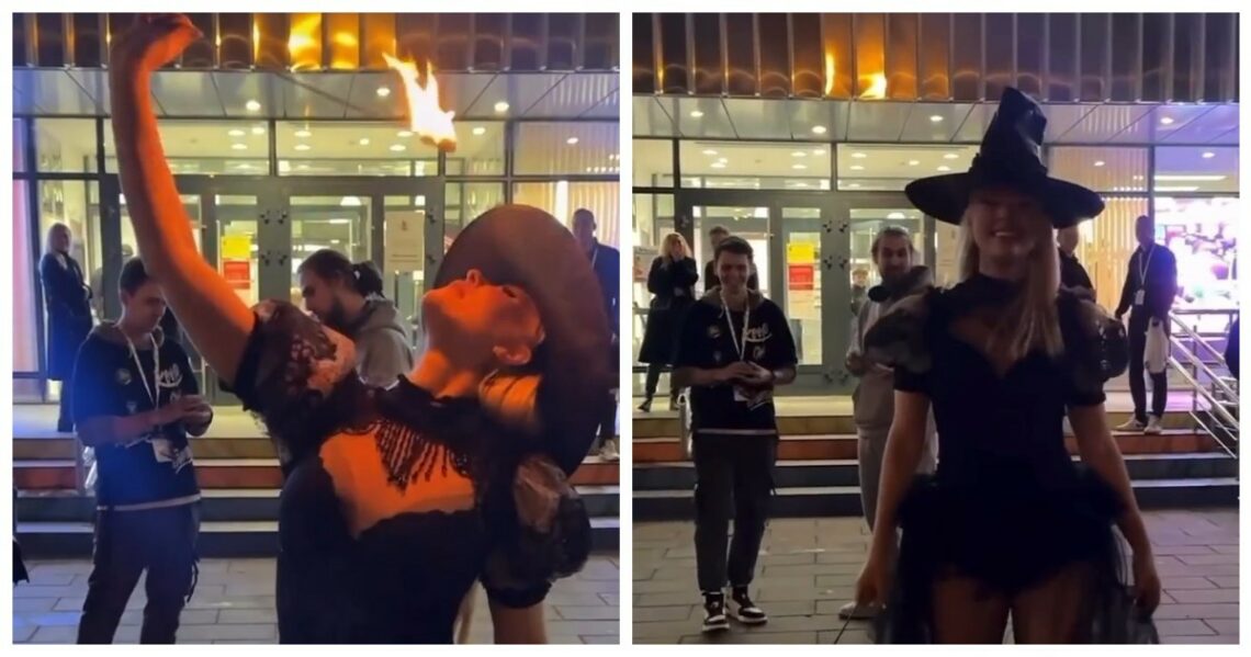 На улицах города девушка в костюме ведьмы привлекла внимание прохожих необычным выступлением. Сначала она виртуозно проглотила зажжённый факел, а затем продемонстрировала неожиданный огненный эффект, от которого публика осталась в восторге.
