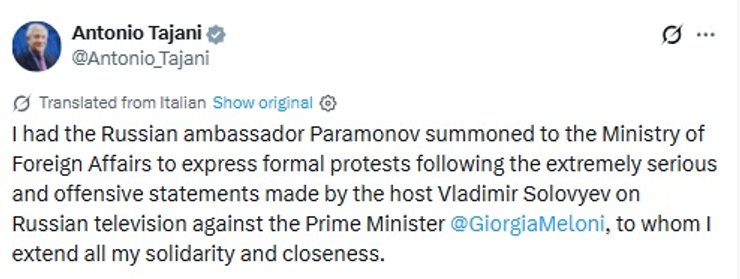 «Я вызвал российского посла Парамонова в Министерство иностранных дел, чтобы выразить официальный протест в связи с крайне серьезными и оскорбительными заявлениями, сделанными ведущим Владимиром Соловьевым на российском телевидении в адрес премьер-министра Джорджии Мелони, которой я выражаю всю свою солидарность и поддержку», — говорится в заявлении.