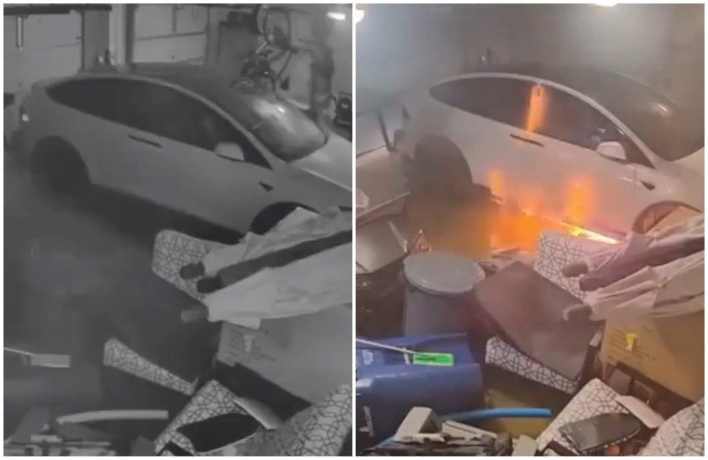 Электромобиль Tesla загорелся, от того, что затопило гараж