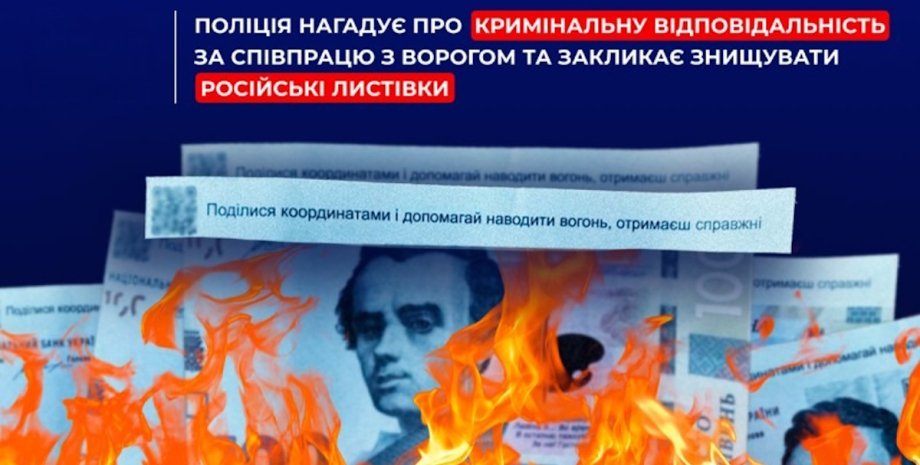 Инфографика полиции | Нацполиция Утром субботы 6 сентября в одном из микрорайонов города Чернигов обнаружили листовки, на которых нарисованы 100-гривневые купюры. Related video Указанную «макулатуру» ВС РФ сбросили с беспилотника, проинформировали в местной полиции. «Поделись координатами и помогай наводить огонь, получишь настоящие», — написано на листовках, которые напоминают купюры номиналом…