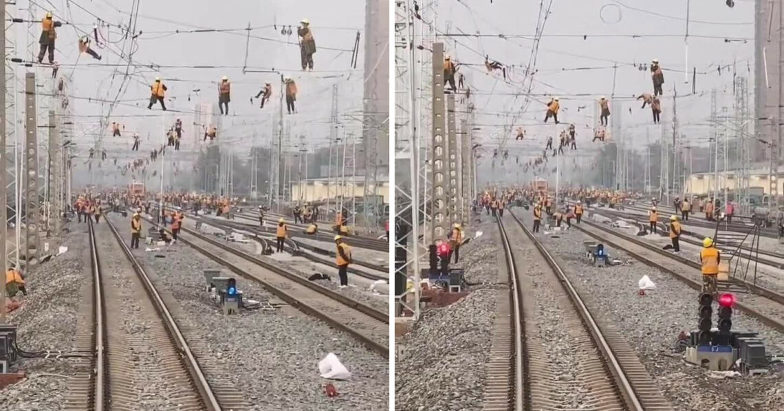 Китайские рабочие произвели крупный ремонт проводов на железнодорожной линии