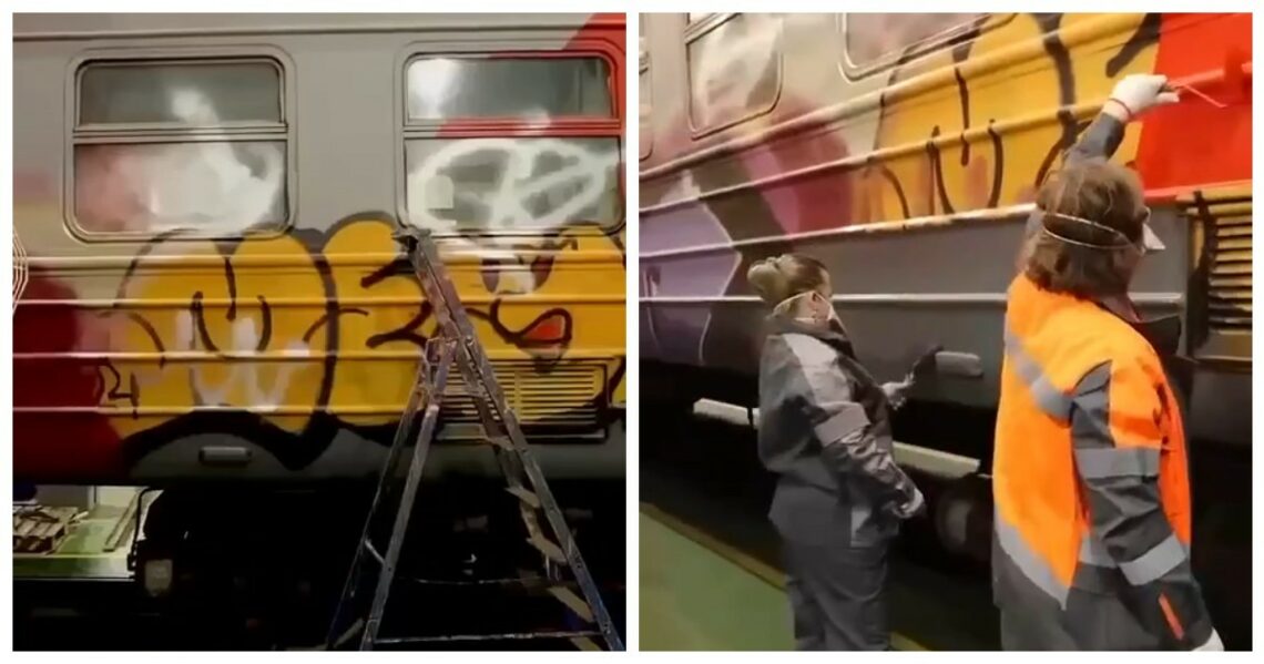Сотрудники Российских железных дорог продемонстрировали процесс очистки вагонов от следов граффити-художников