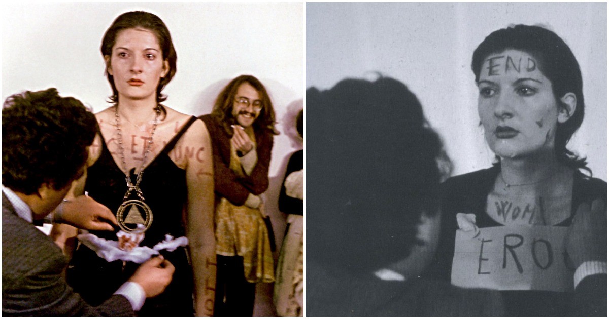 Вначале розой просто проводили по коже художницы, но спустя несколько часов стали колоть шипами. Обливали её кожу попеременно холодной водой и маслом, крепили на тело Марины таблички с разными надписями. И вот, один из гостей, взял в руку пистолет… Он вложил его в руку Абрамович, проверил, заряжен ли он, приставил…