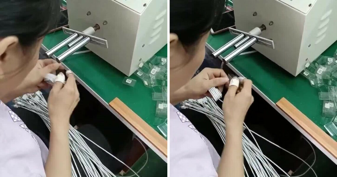 На видео показали процесс упаковки зарядных кабелей на фабрике в Китае ️