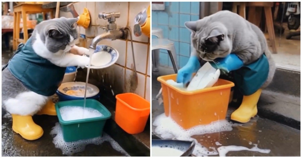 Пользователь сети показал, как выглядели бы моющие посуду коты