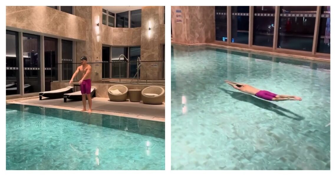 Спортсмен проплыл бассейн, не нарушая водной глади