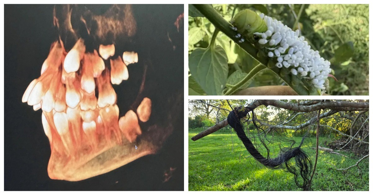 «Такие гусеницы питаются листьями томатов и в конце концов превращаются в бабочек-бражников. Под кожу этой бедняги отложили яйца паразитические осы-бракониды. Она ослабла настолько, что скоро умрёт».