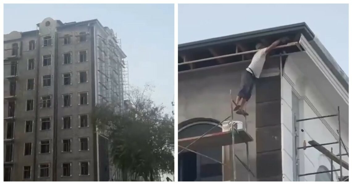 В Узбекистане засняли местного рабочего, который стоял в тапочках на краю строительных лесов
