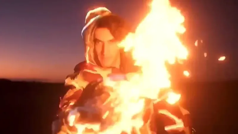 При нажатии на смарт-часы созданный парнем костюм превратил его в живой факел. Когда верхний слой костюма из пиробумаги эффектно сгорел, под ним появилась стальная оплетка и никель-титановый слой, защищающий кожу от огня. Теперь Джейку нужно сделать костюм Человека-льда, чтобы в непредвиденных случаях было кому тушить все эти «горячие» эксперименты.