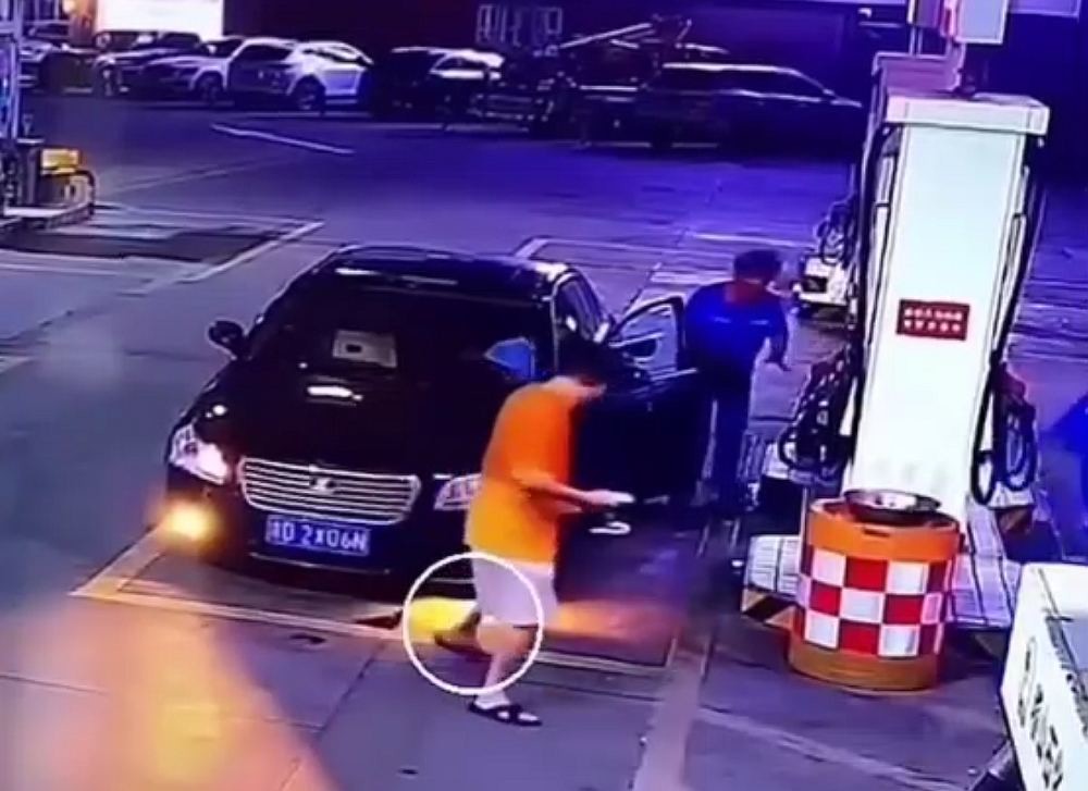 Работник АЗС в Китае быстро сориентировался в ситуации и начал тушить пожар