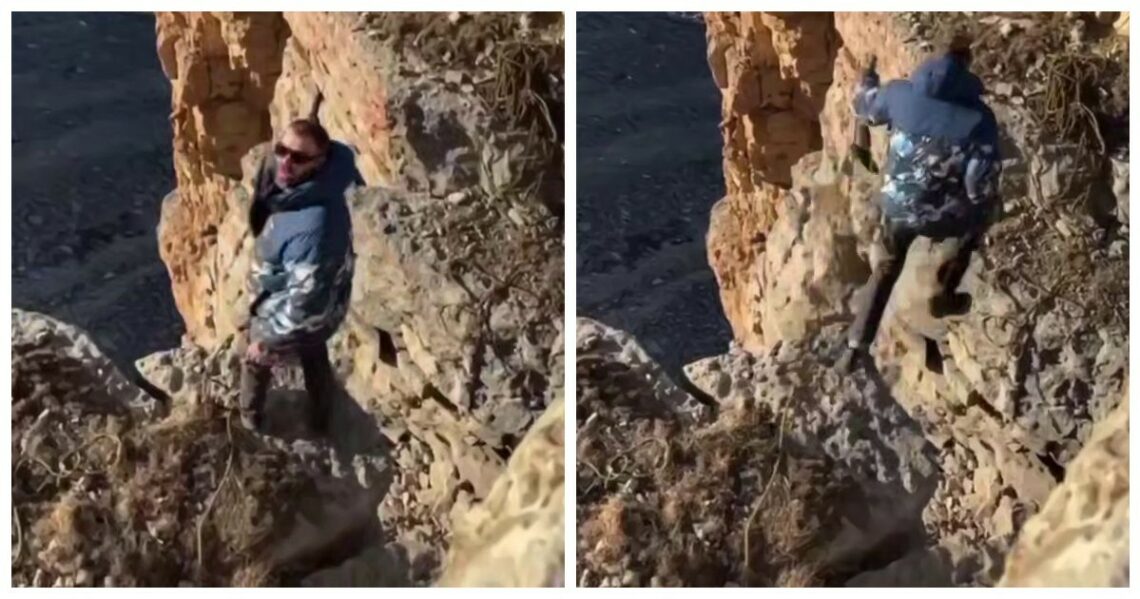 Но что-то пошло не по плану: «прыжок веры» молодого человека хоть и получился, но по инерции из-за перевеса снаряжения его потянуло вниз в пропасть. К счастью, скалолаз не пострадал.
