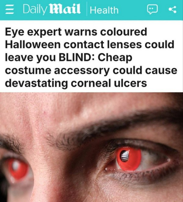 «Если вы планировали надеть цветные контактные линзы, чтобы сделать свой образ на Хэллоуин эффектнее, эксперт призывает вас передумать. Офтальмолог Тина Патель предупредила, что линзы, которые покупают чисто ради изменения образа, могут быть опасны. Даже если носить их всего несколько часов, можно занести в глаза инфекцию, повредить их и даже остаться…