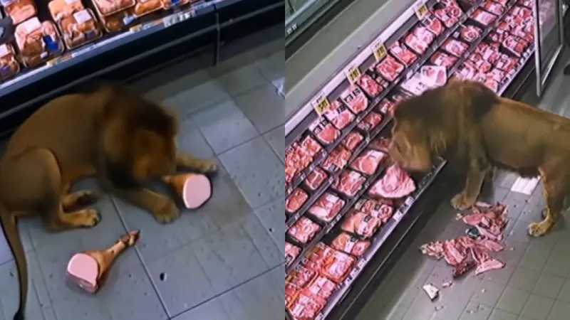 Инцидент произошел в одном из супермаркетов в ЮАР и попал на записи камер видеонаблюдения. Дикий лев напугал продавцов и покупателей, внимание хищника привлек мясной отдел. Зверь разгромил витрины, стащил несколько кусков мяса и плотно пообедал. Специалисты центра охраны дикой природы вывезли льва в безопасное место и выпустили на волю. Отмечается, что хищник не проявлял агрессии к людям.