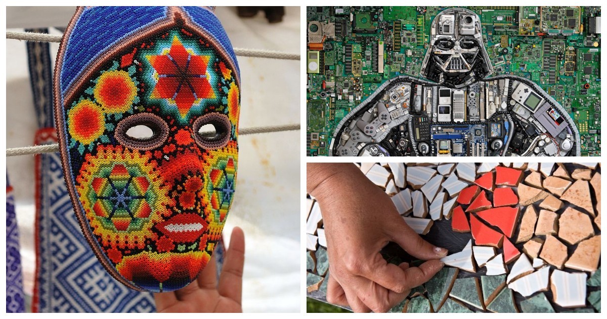 По мере развития техники создания изображений из прикрепляемых к основе фрагментов расширился и перечень используемых материалов. Сегодня для этого используют древесину, раковины, стекло, ветки, бусины, пуговицы, камни, керамические черепки, бумагу и не только. И из прозаичных вещей получаются если не шедевры искусства, то вполне себе интересные и достойные работы.