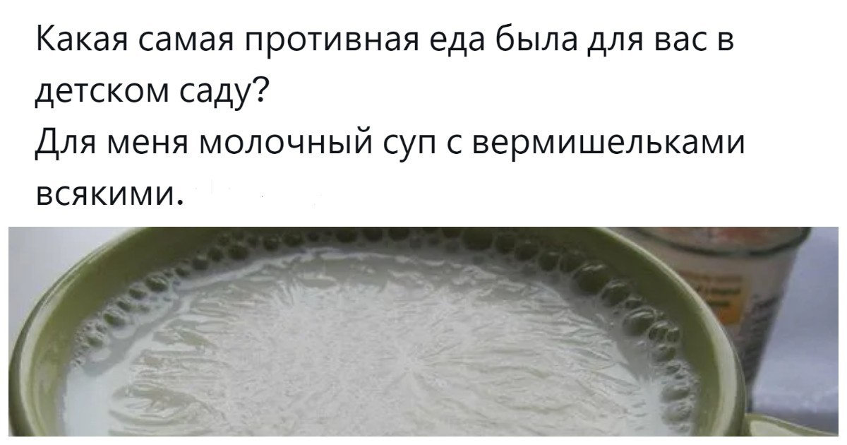 Молочный суп, рассольник, кисель: пользователи поделились трагическими воспоминаниями о детсадовских блюдах
