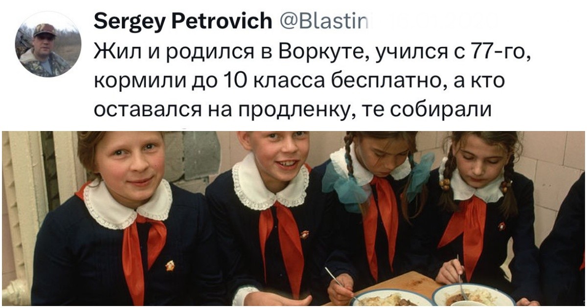 Спелая кукурузинка Автор: 20 августа 2024 17:50 Школьные обеды в СССР были важной частью образовательной системы, обеспечивая детей сбалансированным питанием. Организация школьного питания была централизованной и строго контролировалась государством. Однако у всех было по-разному — и мы собрали воспоминания людей того времени. Стоимость В 1950-1960-х годах школьные обеды были бесплатными…