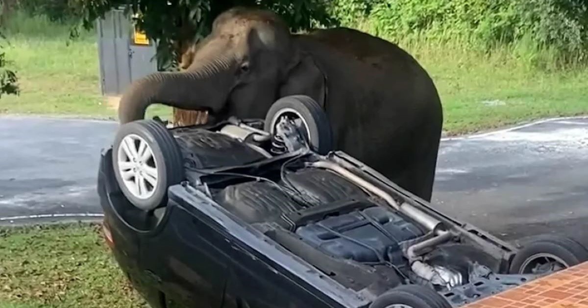 Слониха пришла на запах шашлыка и перевернула автомобиль