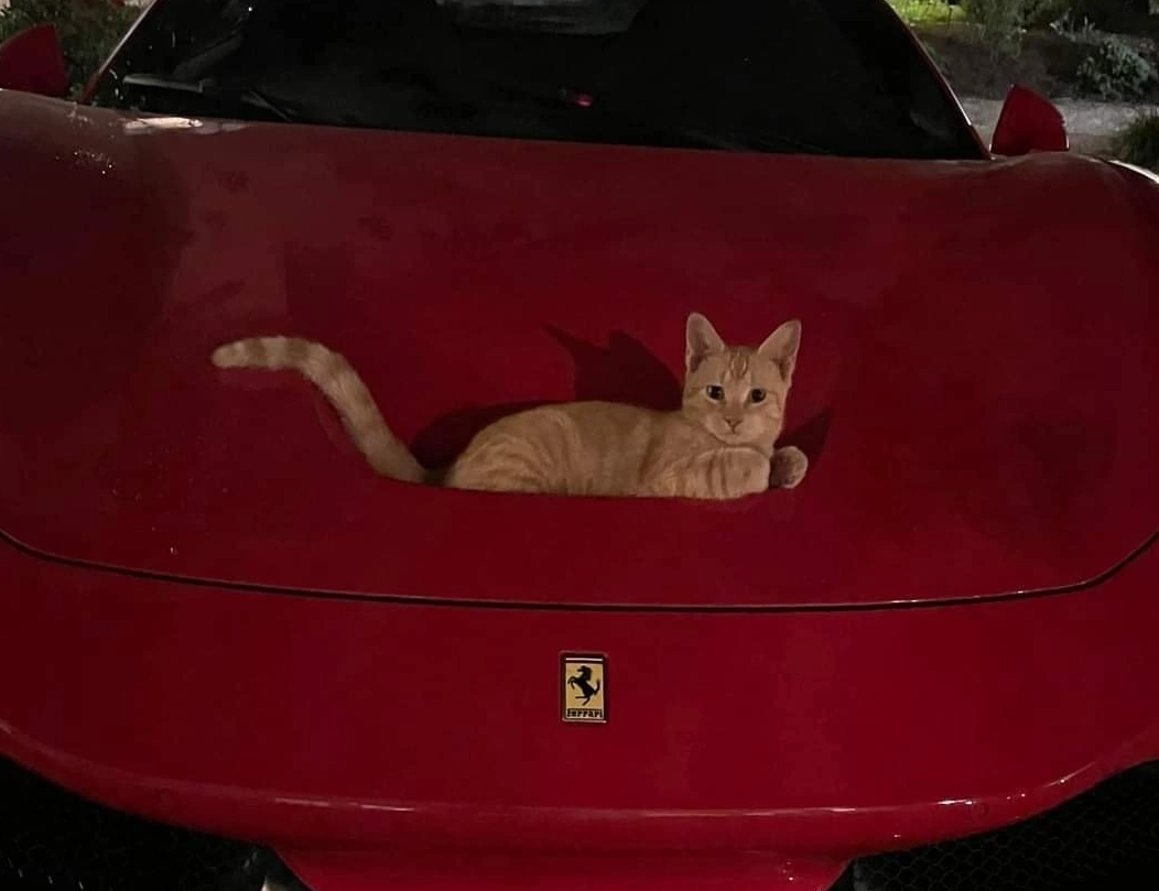 Его глаза полны сонного довольства, а хвост свисает с края капота, создавая контраст с роскошным автомобилем. На некоторых фото кот тянется, будто проверяя, достаточно ли ему комфортно.