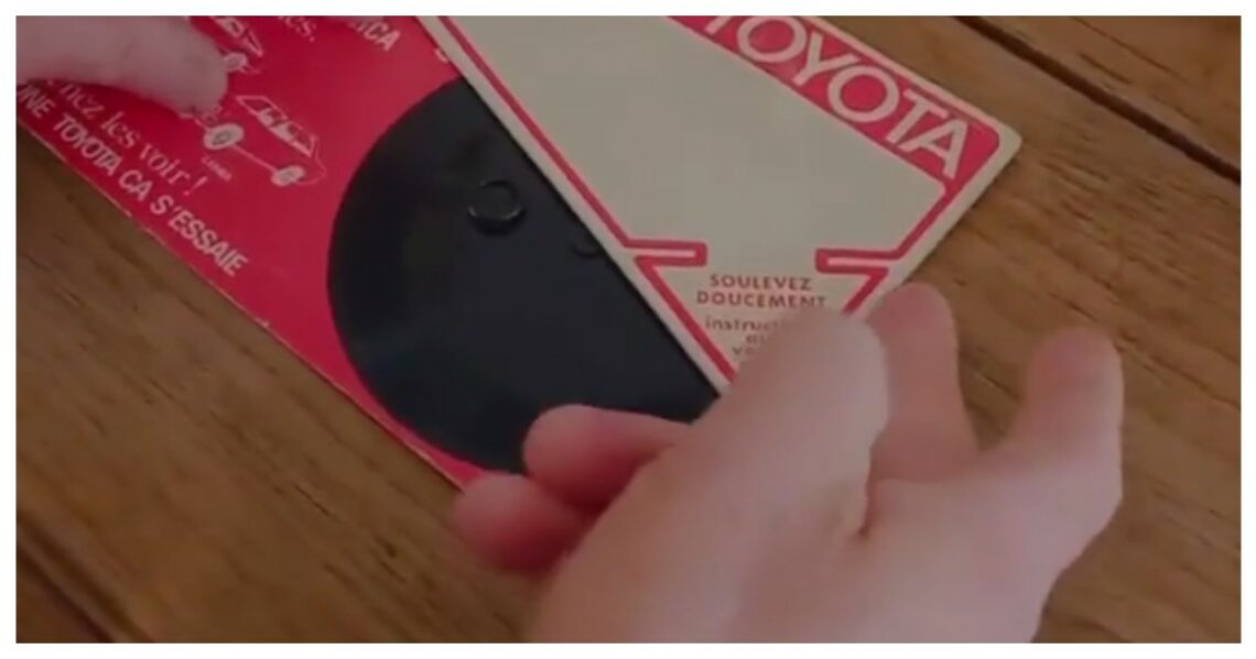 Конверт содержал иглу, а верхняя часть складывалась треугольником, образуя подобие динамика: если покрутить диск пальцем, можно было услышать запись с рекламой моделей Celica и Carina.